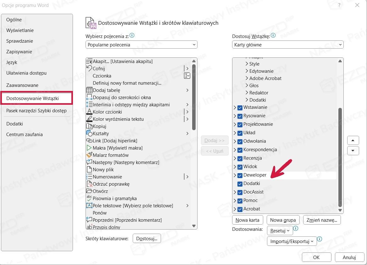 - w menu Opcje odnaleźć Dostosowywanie Wstążki,