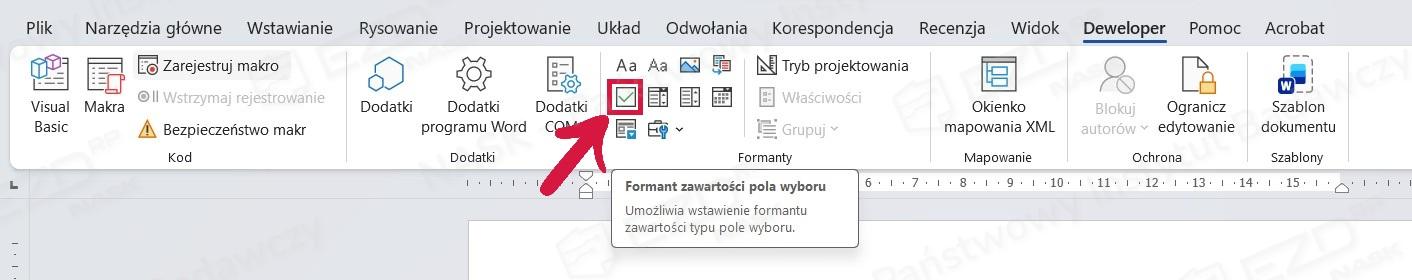 Na wstążce pojawi się zakładka Deweloper i przycisk z zaznaczonym polem wyboru o nazwie: Formant zawartości pola wyboru.