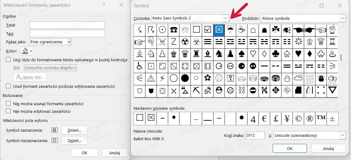 Dla symbolu zaznaczenia i niezaznaczenia należy wybrać przycisk Zmień i wybrać symbol z czcionek wspieranych w EZD RP – rekomendujemy Noto Sans Symbols 2.