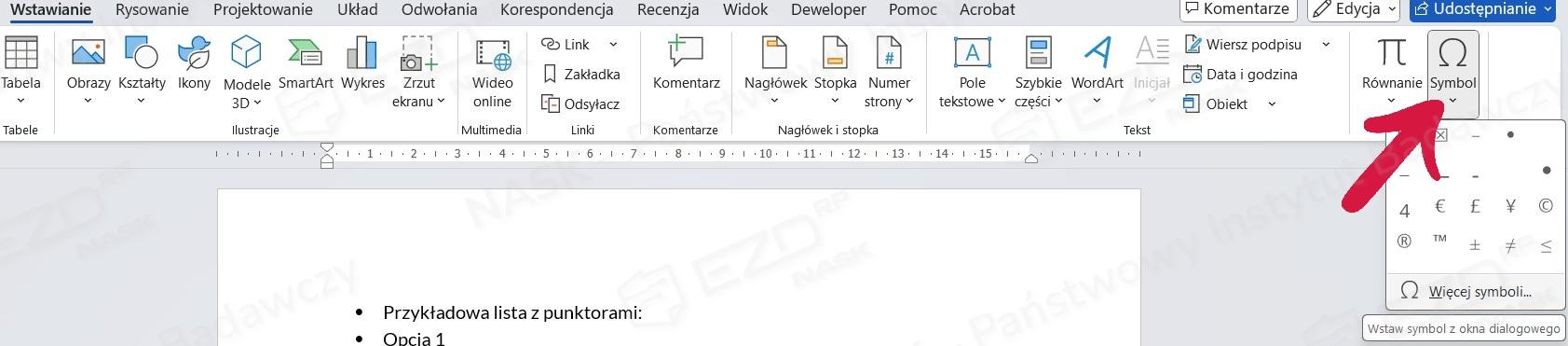 Wstawienie dowolnego niestandardowego symbolu odbywa się poprzez menu Wstawianie > Symbol > Więcej symboli