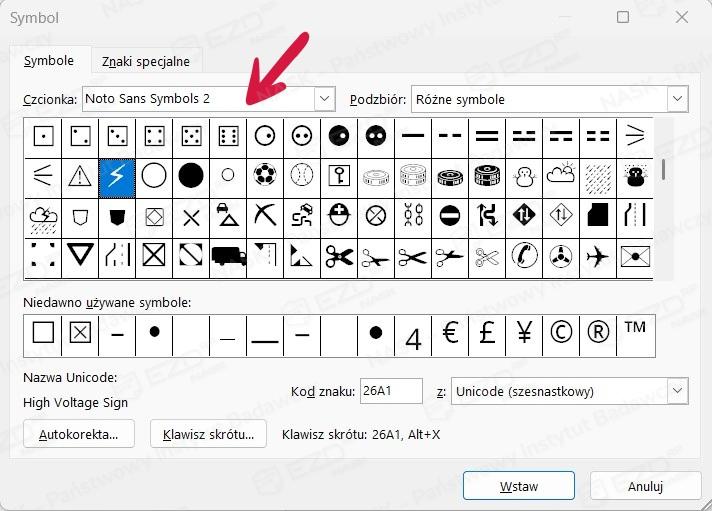 W menu należy wybrać odpowiednią czcionkę i symbol, a następnie potwierdzić przyciskiem Wstaw.