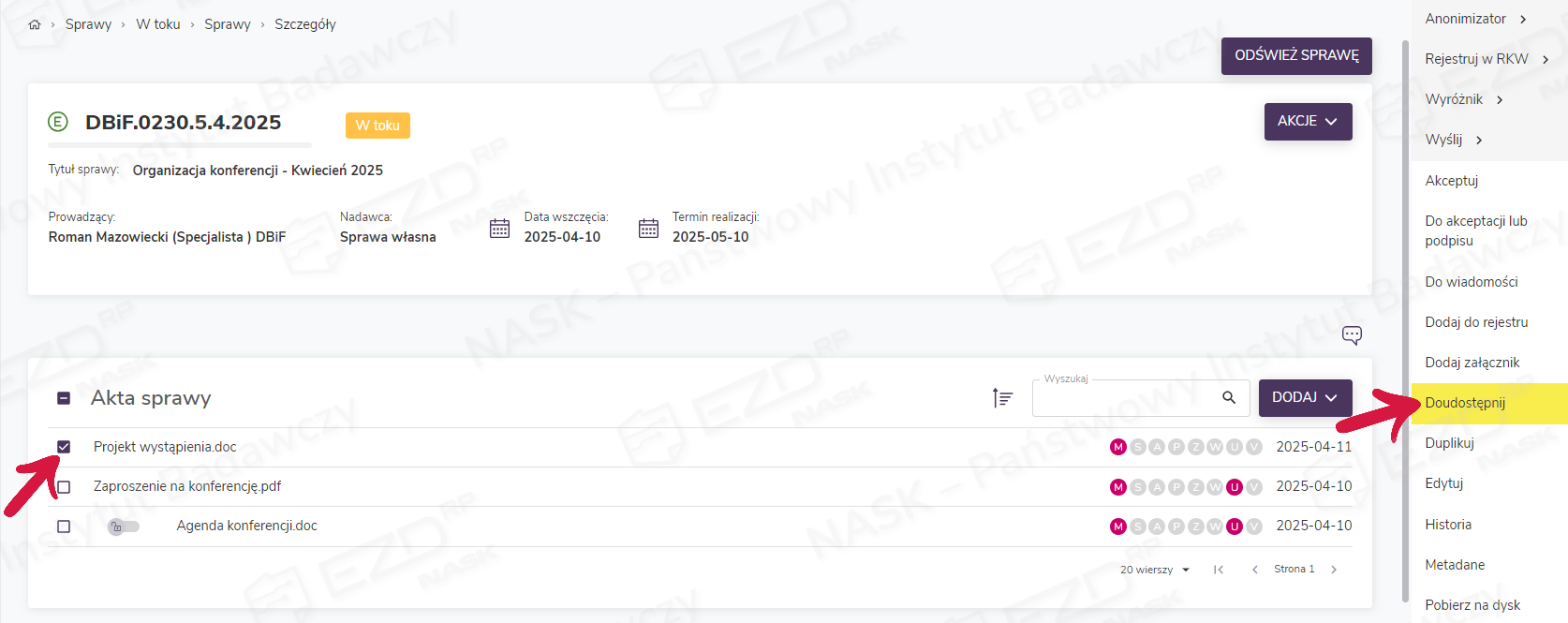 Aby doudostępnić dokumenty, należy przejść do widoku Akt sprawy i zaznaczyć pola wyboru przy nazwach dokumentów, które mają zostać doudostępnione. Następnie w menu kontekstowym po prawej stronie ekranu trzeba wybrać opcję Doudostępnij.