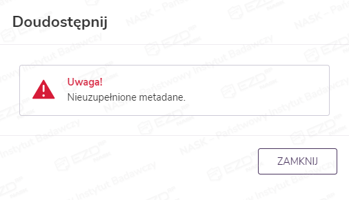 System sprawdzi, czy w dokumencie, który ma zostać doudostępniony, uzupełniono metadane. Jeśli użytkownik nie dopełnił tego obowiązku, pojawi się stosowny komunikat. Należy wówczas wypełnić metadane dokumentu i ponownie wykonać powyżej opisane czynności.