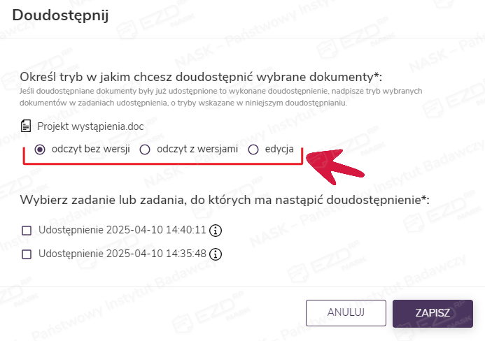 Wyświetli się panel boczny Doudostępnij. W pierwszym kroku należy określić tryb doudostępnienia – Odczyt bez wersji, Odczyt z wersjami lub Edycja. Tryb odczytu umożliwia odbiorcy jedynie zapoznanie się z treścią dokumentu. Można przy tym określić, czy dostępna ma być pełna historia wersji dokumentu, czy tylko jego najnowsza wersja. Z kolei tryb edycji pozwala na wprowadzanie w dokumencie zmian (o ile jego format to umożliwia). W przypadku wskazania do doudostępnienia kilku dokumentów, tryb należy określić osobno dla każdego z nich.
