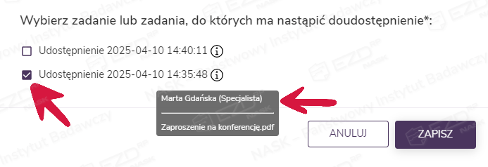 W kolejnym kroku należy wskazać z listy zadanie udostępnienia, do którego ma zostać dołączony plik (lub pliki). Każde z nich jest opatrzone datą i czasem wystawienia. Dodatkowo po najechaniu kursorem na ikonę i znajdującą się przy zadaniu pojawia się podpowiedź, komu zostało ono wystawione i jakich dokumentów dotyczy. Można wskazać do doudostępnienia jednocześnie kilka zadań, niezależnie od ich statusu. Po zaznaczeniu pól wyboru przy konkretnych pozycjach trzeba kliknąć przycisk Zapisz.