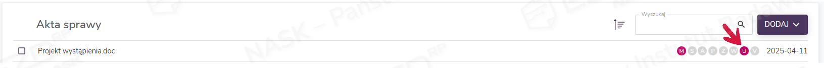 Aktach sprawy przy doudostępnionym dokumencie zostaje wybarwiona ikona U.