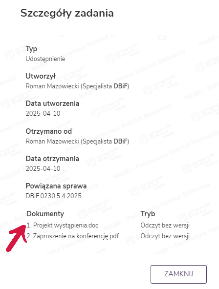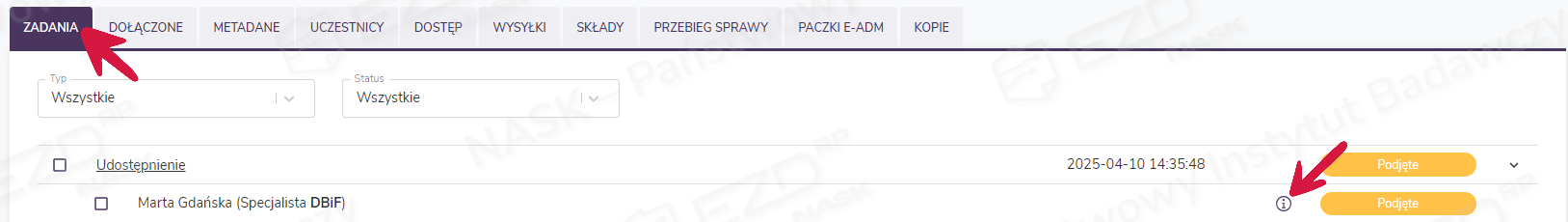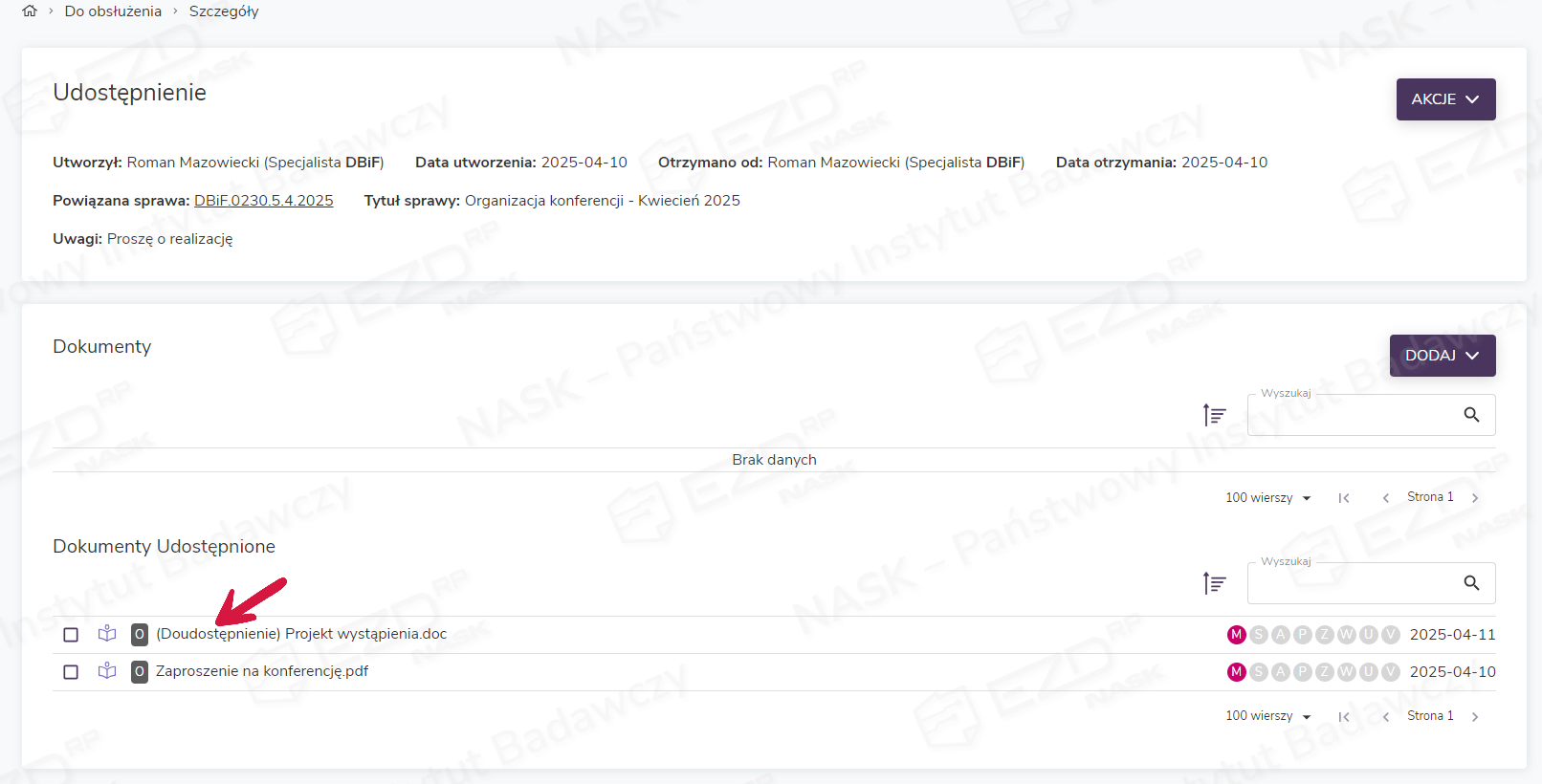 Dokumenty doudostępnione pojawią się w pierwotnym zadaniu niezależnie od tego, czy ma ono status Niepodjęte, Podjęte czy też Zakończone. Będzie można je znaleźć w sekcji Dokumenty udostępnione, a w nazwie będą miały dopisek Doudostepnienie.