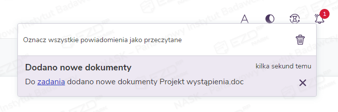 Na koncie użytkownika, któremu doudostępniono dokument, pojawi się powiadomienie wraz z linkiem do zadania.
