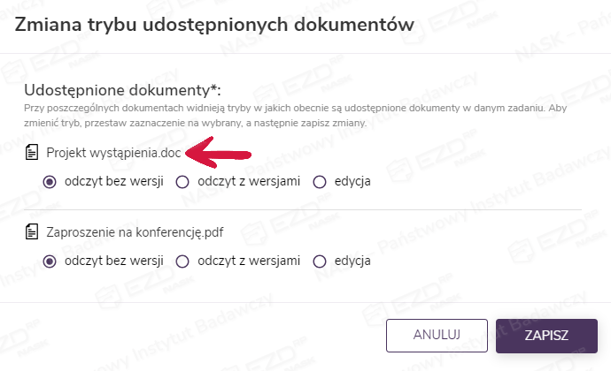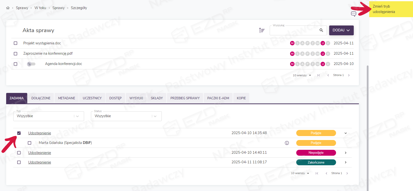 Po doudostępnieniu dokumentów prowadzący sprawę może zarządzać ich trybem udostępnienia na zasadach ogólnych (czyli tak samo jak w przypadku dokumentów udostępnionych wcześniej). W tym celu w zakładce Zadania oznacza pole wyboru przy danym zadaniu, a następnie w prawym menu wybiera opcję Zmień tryb udostępnienia.
