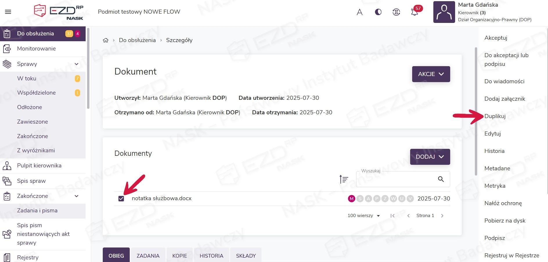 W module Do obsłużenia można duplikować edytowalne dokumenty wewnętrzne znajdujące się w obiektach należących do kategorii Dokument, Kopia oraz Przekazanie – w tym również Przekazanie (Kopia). Aby wykonać tę czynność, należy przy dokumencie wewnętrznym w szczegółach obiektu zaznaczyć pole wyboru i w menu kontekstowym z prawej strony ekranu kliknąć opcję Duplikuj.