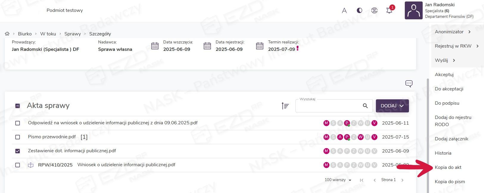 Funkcja Kopia do akt jest dostępna dla dokumentów wewnętrznych znajdujących się w Aktach spraw będących W toku.