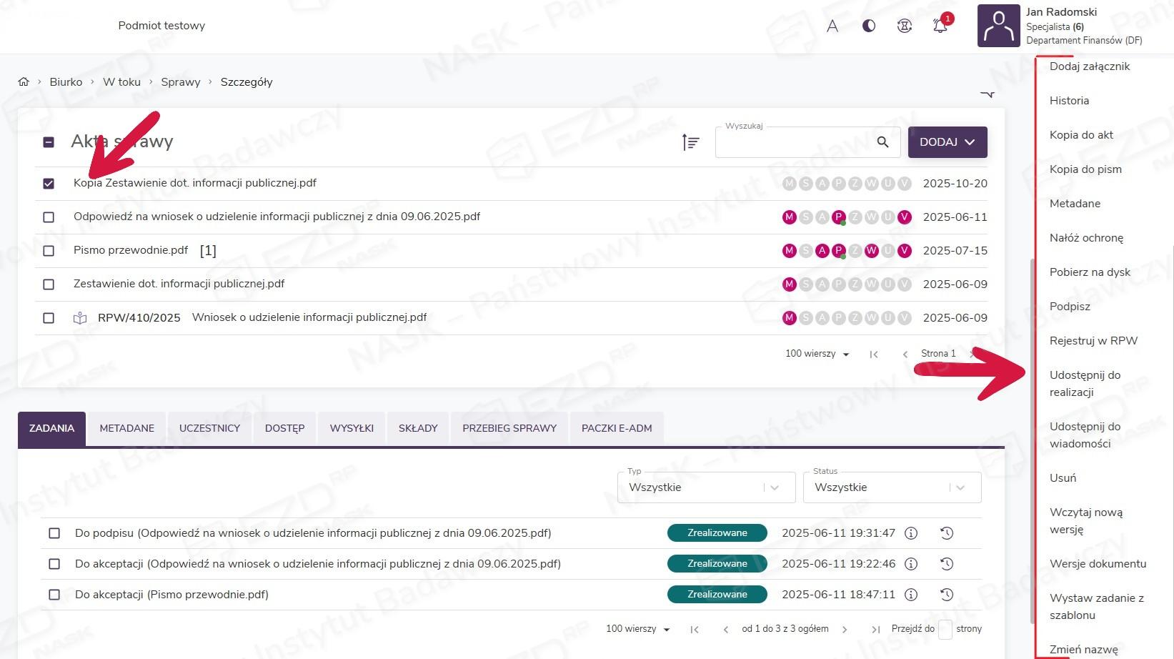 W nazwach skopiowanych dokumentów dodany zostanie wyraz „kopia”, który użytkownik może usunąć przy pomocy opcji Zmień nazwę. Dodatkowo w menu kontekstowym dostępne są pozostałe akcje możliwe do wykonania na skopiowanym dokumencie.