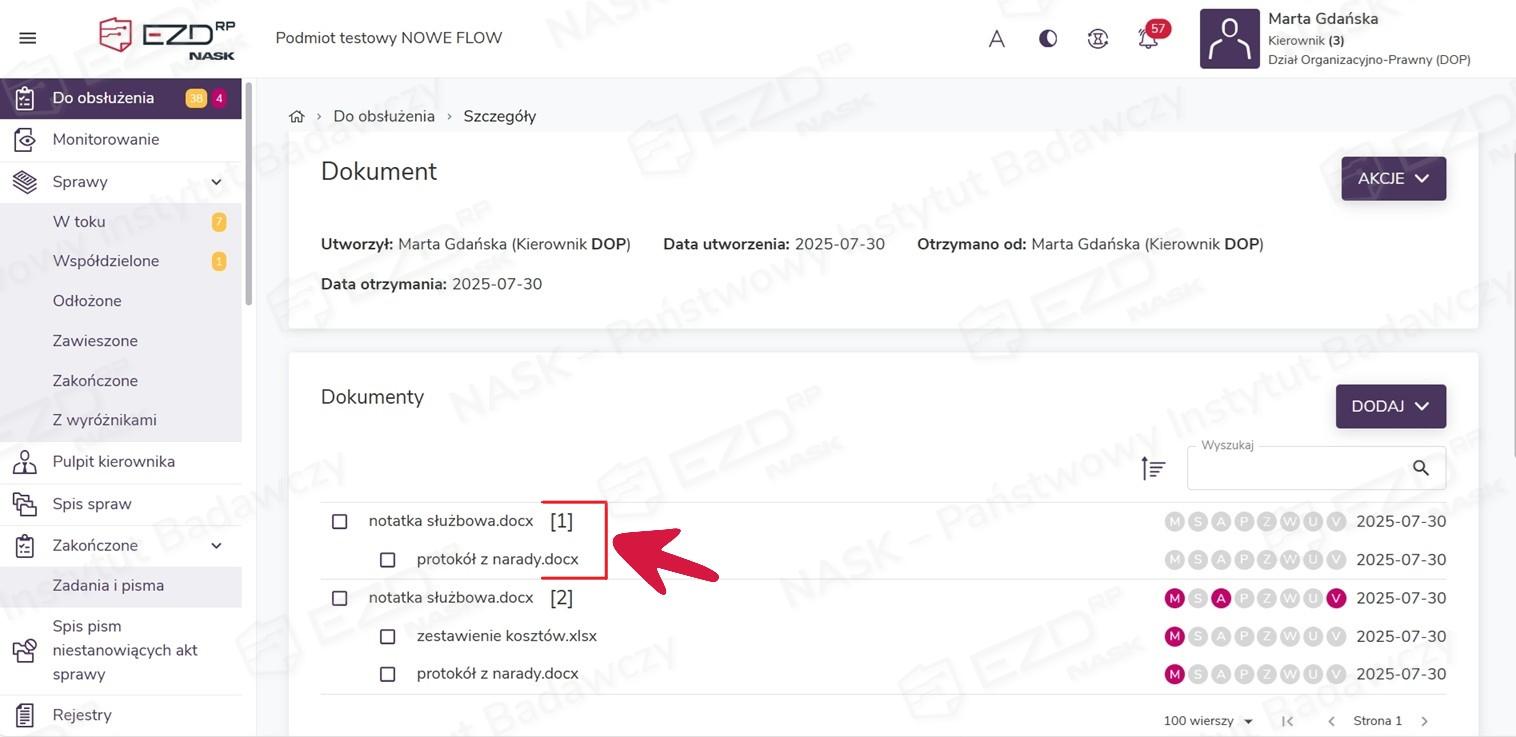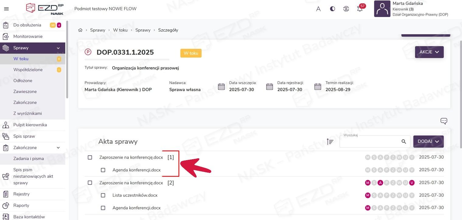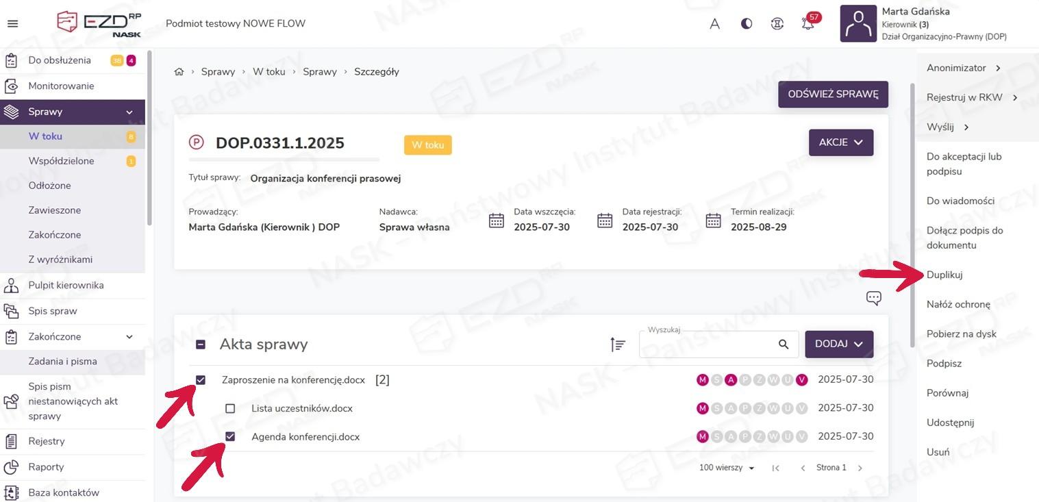 Duplikaty zaznaczonych dokumentów wewnętrznych pojawią się w Aktach sprawy.