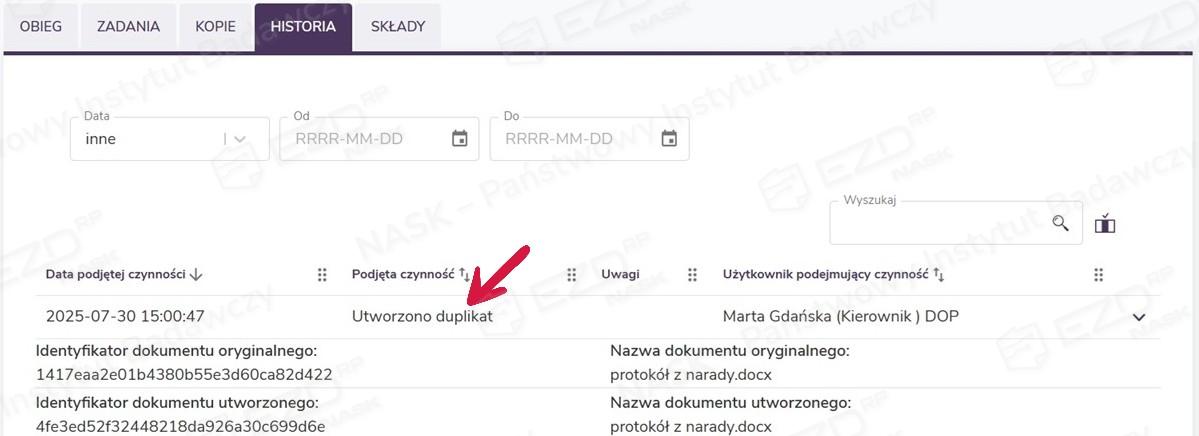 Wpis o utworzonym duplikacie odłoży się w zakładce Historia wraz z informacją o nadaniu dla utworzonego dokumentu nowego identyfikatora.