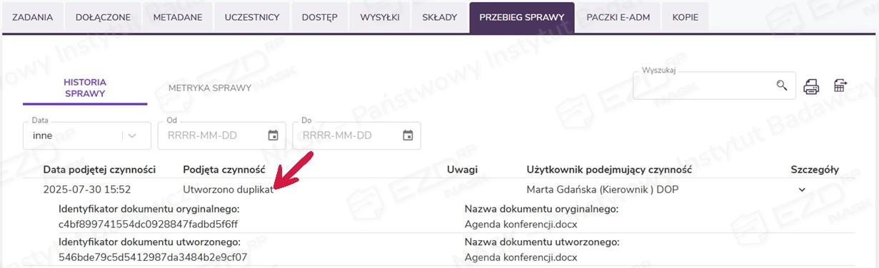 Wpis o utworzonym duplikacie odłoży się w zakładce Przebieg sprawy wraz z informacją o nadaniu dla utworzonego dokumentu nowego identyfikatora.