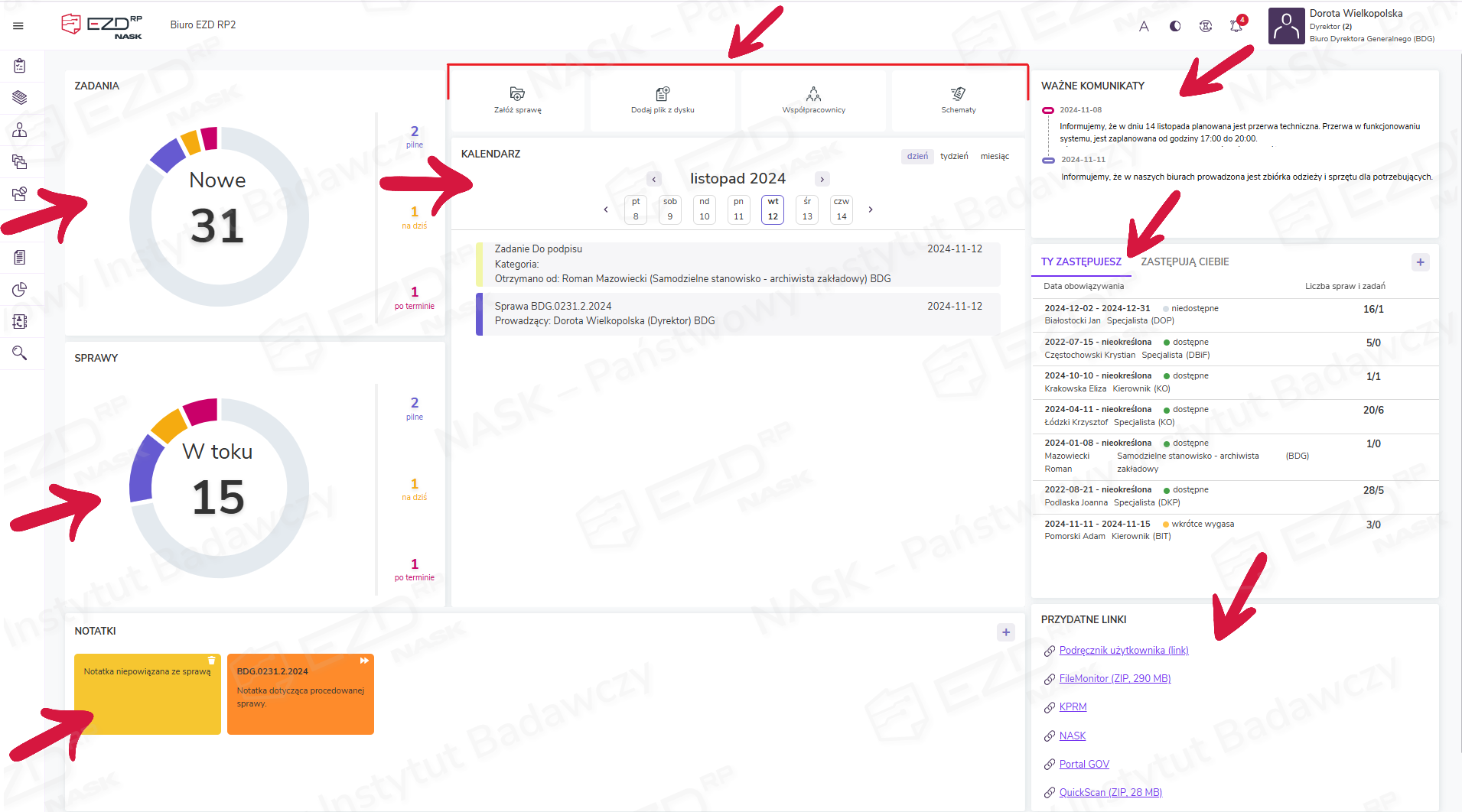 Notatki – funkcja inspirowana samoprzylepną żółtą karteczką, którą często można znaleźć na blacie biurka pracownika lub przyklejoną do akt sprawy. Do ekranu startowego mogą być przypięte notatki własne dodane do akt sprawy lub notatki tworzone bezpośrednio na stronie głównej (nie są powiązane z procedowanymi sprawami, mogą przypominać o ważnych dla użytkownika w danym momencie wydarzeniach).