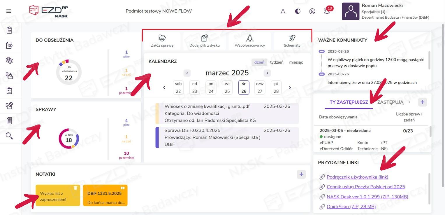 Ekran startowy jest głównym oknem widocznym po zalogowaniu do systemu i jednocześnie centralnym miejscem, w którym prezentowane są najważniejsze dla użytkownika informacje oraz z poziomu którego można przejść do innych modułów EZD RP.