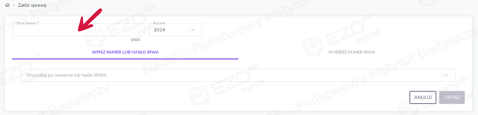 Załóż sprawę (kafelek) – kliknięcie tego przycisku wyświetla okno, w którym użytkownik może założyć sprawę wszczętą z urzędu, tzw. własną, wpisując jej tytuł oraz wskazując klasę JRWA.