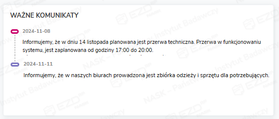 Ważne komunikaty – obszar ekranu startowego, w którym wyświetlane są dwa rodzaje komunikatów – systemowe (znacznik różowy) oraz administratora (niebieski).