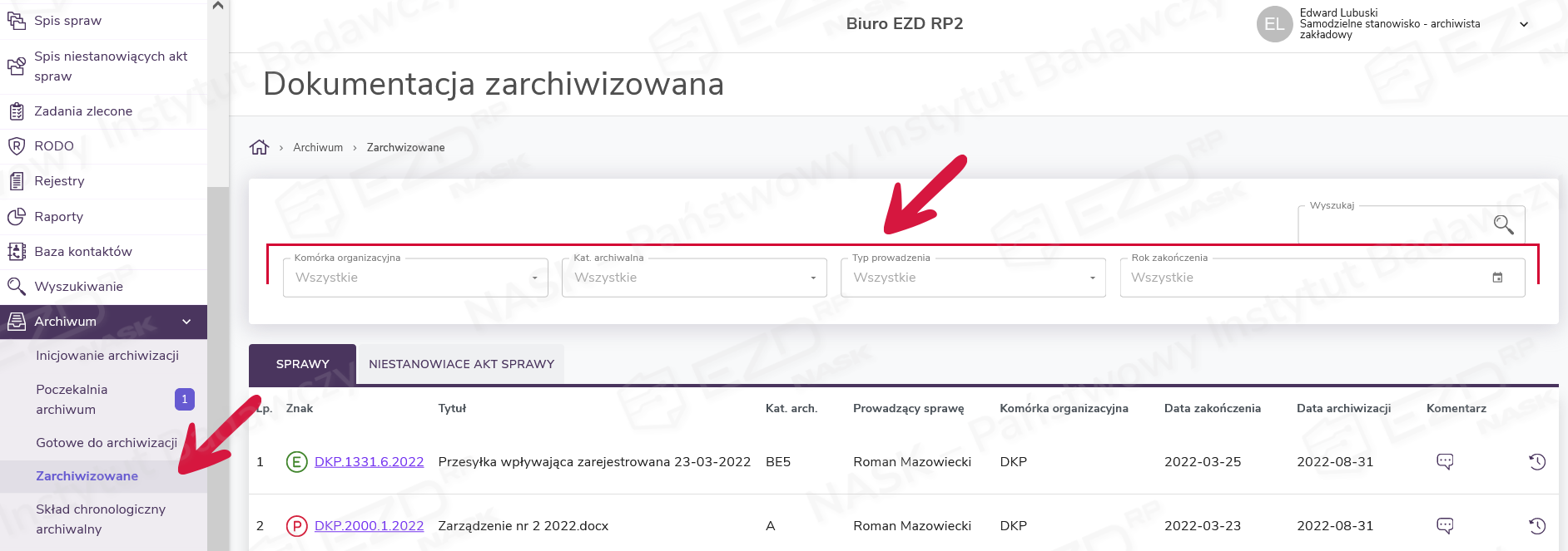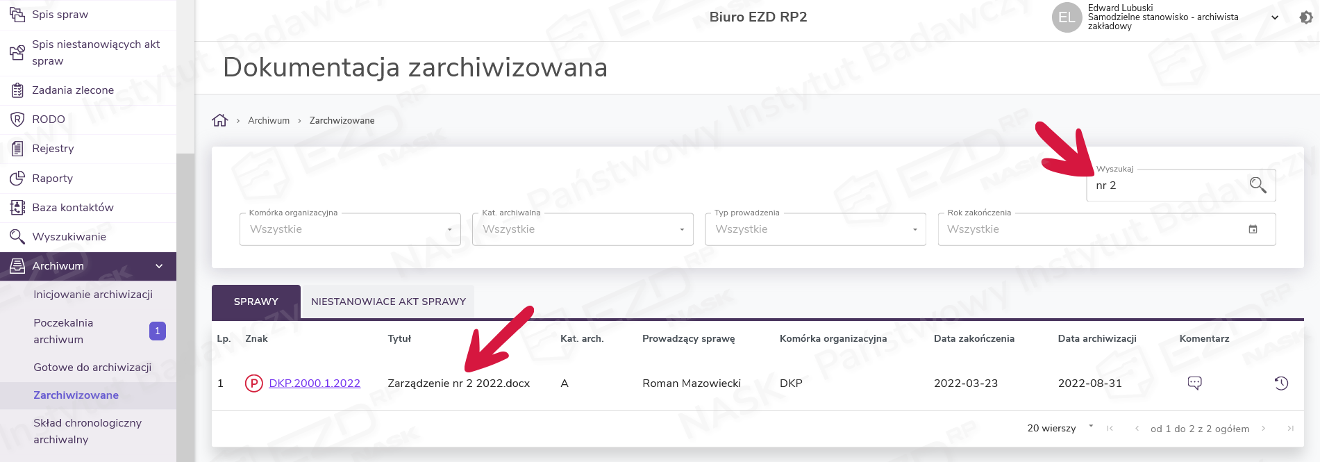 Sekcja Zarchiwizowane to miejsce, gdzie prezentowane są informacje o całej przejętej na stan archiwum zakładowego dokumentacji, która została prawidłowo uporządkowana. Aby zobaczyć zestawienie, należy przejść do widoku Archiwum > Zarchiwizowane, w którym dostępne są dwie zakładki: Sprawy oraz Niestanowiące akt sprawy.