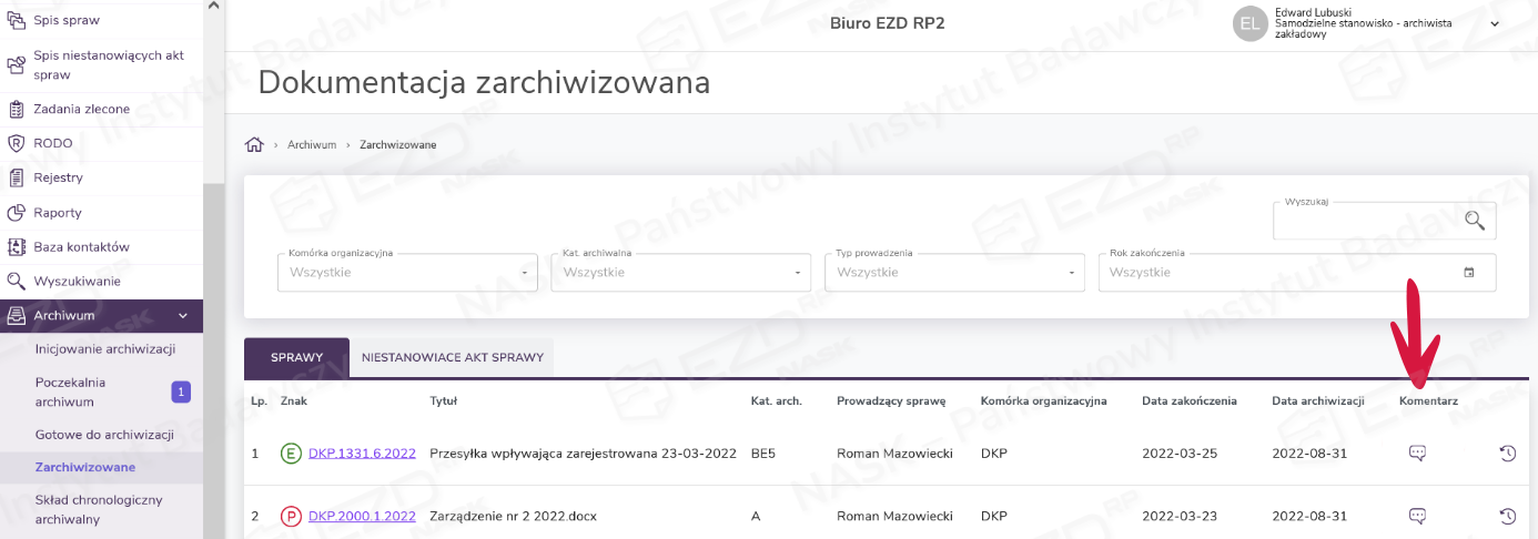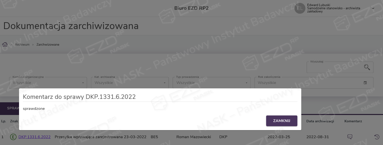 Dodatkowo w kolumnie Komentarz możemy wyświetlić treść ostatniego komentarza wpisanego przez archiwistę w trakcie archiwizacji (ikona tzw. dymka).