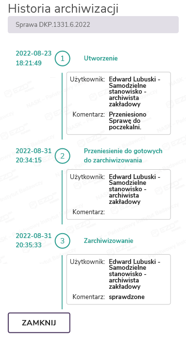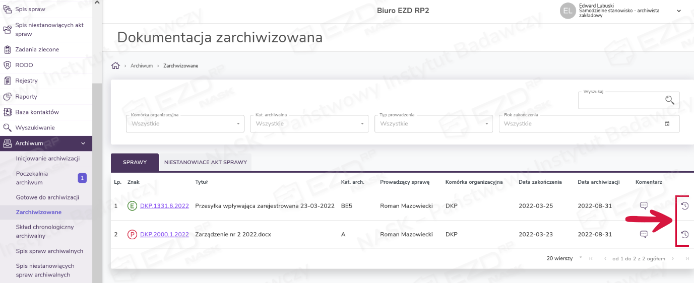 W ostatniej kolumnie zestawienia dostępna jest ikona pozwalająca wyświetlić historię archiwizacji danej sprawy lub pisma NAS.