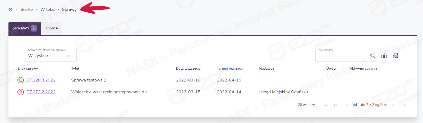 Użytkownik ma możliwość grupowania dokumentów w obrębie akt sprawy poprzez tworzenie katalogów oraz dodawanie do nich dokumentów. W tym celu z poziomu lewego menu na stronie startowej przechodzi do sekcji Biurko > W toku > Sprawy, gdzie zostaje wyświetlona lista spraw.