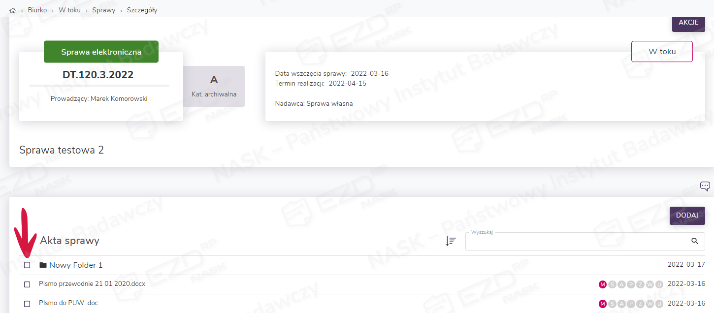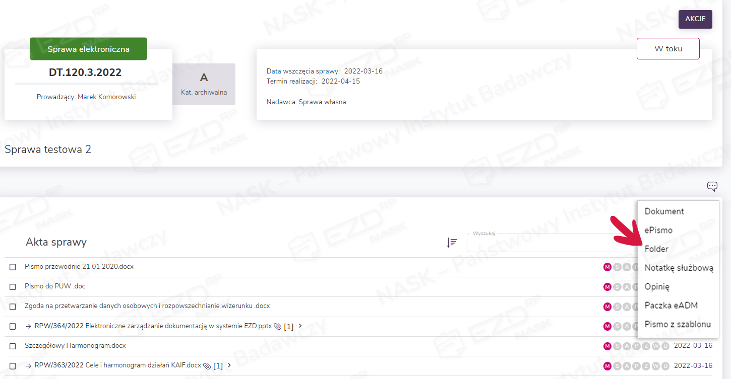 Użytkownik wybiera sprawę, klikając znak sprawy. Przechodzi do sekcji Akta sprawy, gdzie wybiera funkcję Dodaj > Folder.