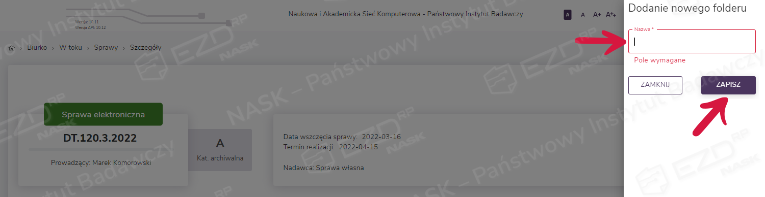 Po kliknięciu opcji Folder w prawej części okna pojawi się panel Dodanie nowego folderu. Użytkownik wprowadza nazwę dla folderu i klika przycisk Zapisz.