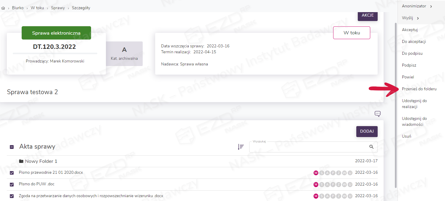 Następnie użytkownik zaznacza pliki do przeniesienia do folderu w aktach sprawy i z prawego menu wybiera funkcję Przenieś do folderu.