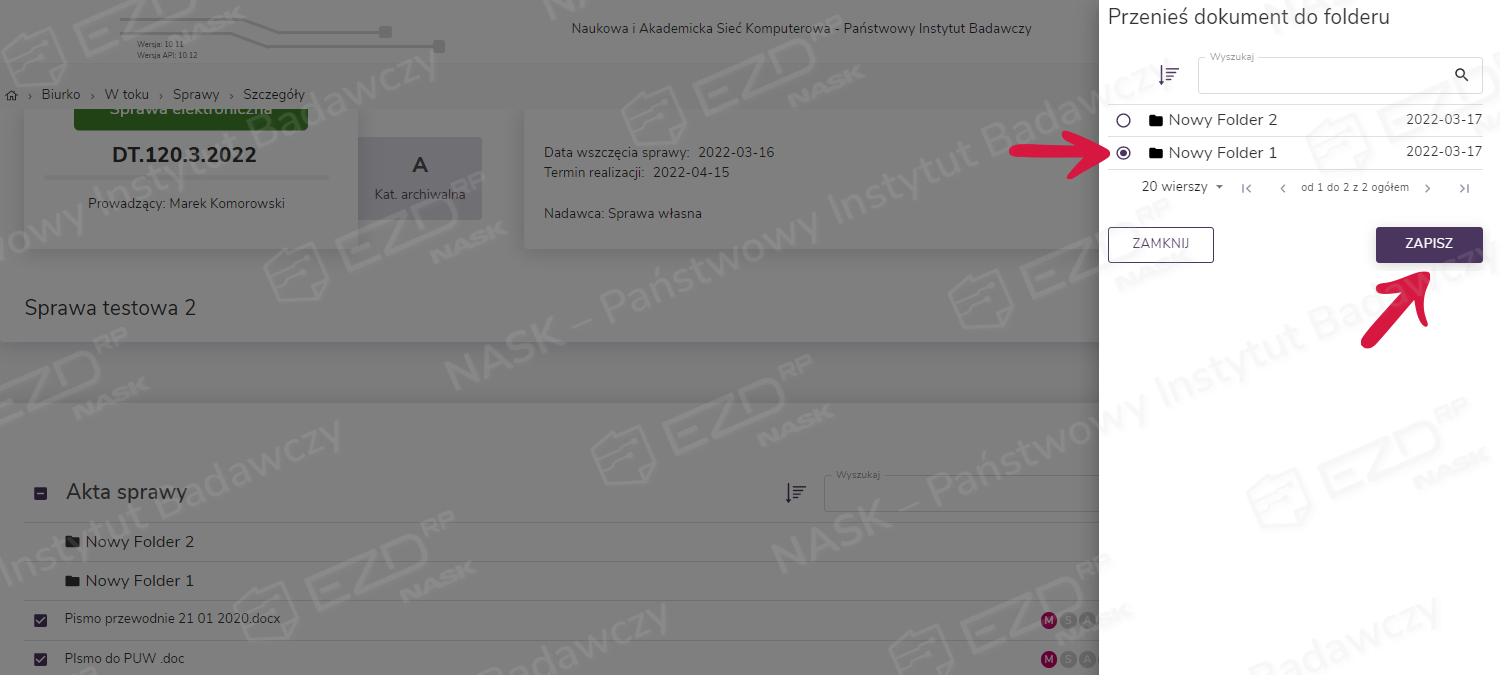 W prawej części okna pojawi się panel Przenieś dokument do folderu z listą katalogów w aktach danej sprawy. Użytkownik wskazuje odpowiedni folder, zaznacza pole wyboru przy jego nazwie i klika przycisk Zapisz.