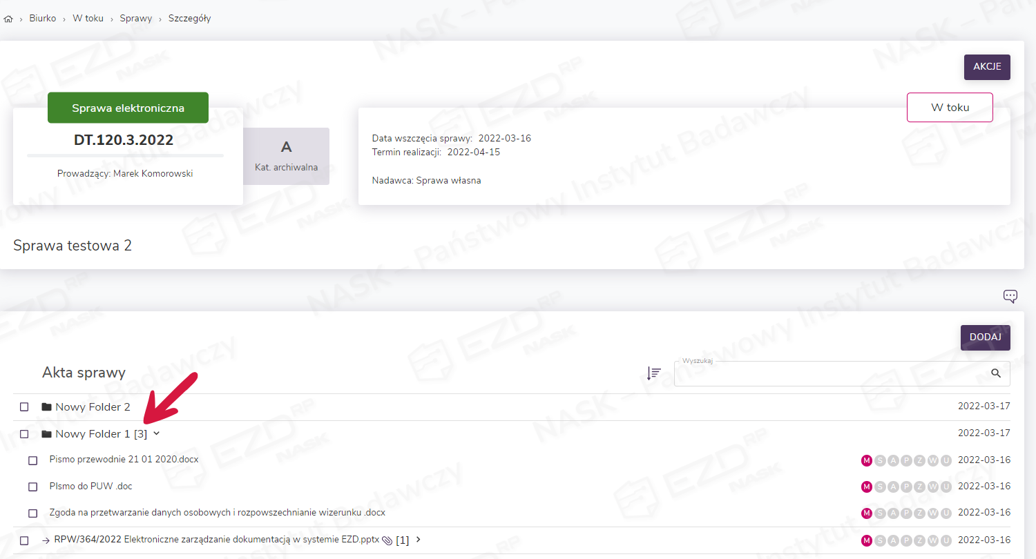 Po kliknięciu symbolu rozwinięcia widocznego przy nazwie folderu, użytkownik zobaczy zaznaczone dokumenty zgrupowane w utworzonym katalogu w aktach wybranej sprawy.