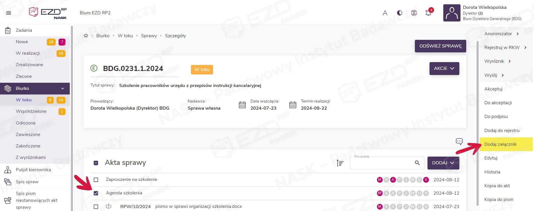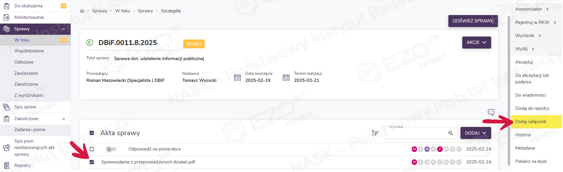 Załączniki można dodać do dokumentu głównego, który znajduje się w Aktach sprawy lub w Pismach, w Biurku pracownika. W tym celu należy zaznaczyć nadrzędny dokument, do którego chcemy dodać kolejne – jako załączniki.
