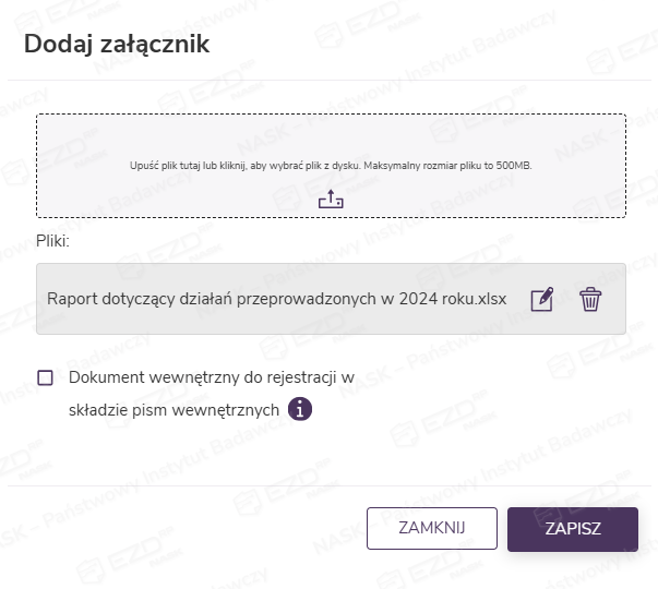 Z menu kontekstowego wybieramy funkcję Dodaj załącznik. W prawej części okna wyświetli się panel boczny, w którym można dodać dokumenty z dysku lub przenieść je za pomocą myszy i upuścić na zaznaczone pole. Użytkownik może zmienić nazwę dokumentu, klikając ikonę ołówka, lub usunąć zbędny plik za pomocą ikony kosza.