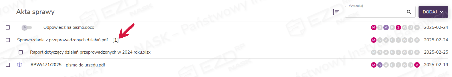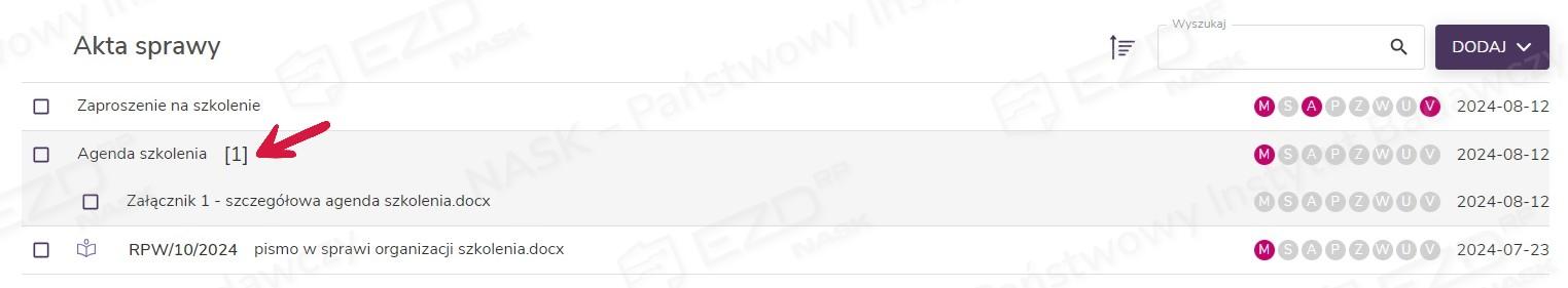 W Aktach sprawy przy piśmie nadrzędnym wyświetlona zostanie w nawiasie kwadratowym liczba załączników. Kliknięcie jej (lub poza nią, z prawej strony) spowoduje rozwinięcie ich listy.