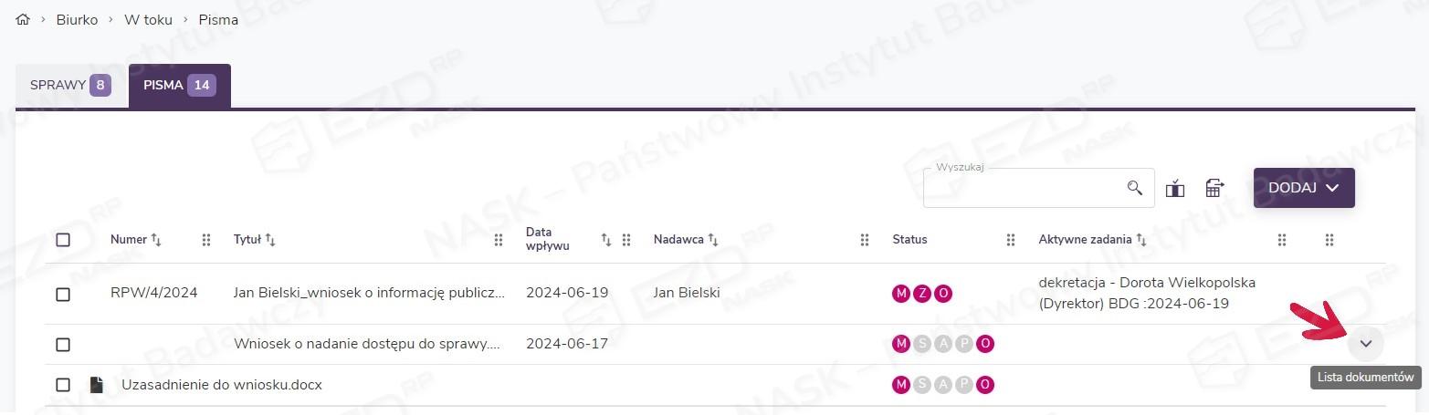 Załączniki dodane do dokumentów znajdujących się w zakładce Pisma widoczne są po kliknięciu ikony ze strzałką umieszczonej na końcu wiersza.