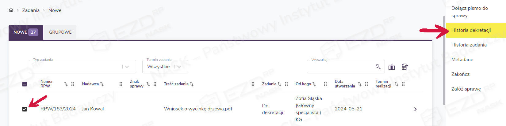 W celu zapoznania się z historią dekretacji pism niepowiązanych ze sprawą użytkownik powinien wejść do dowolnej sekcji zadań (np. Zadania > Nowe), a następnie zaznaczyć interesujące go zadanie i w prawym menu kliknąć funkcję Historia dekretacji.