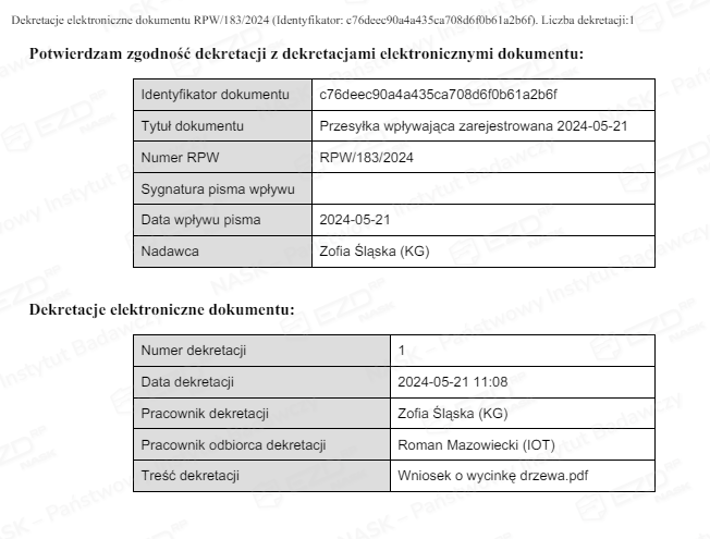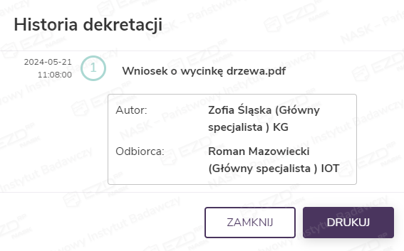 Dane dotyczące dekretacji można przygotować do wydruku. Po kliknięciu przycisku Drukuj system wygeneruje plik w formacie PDF i wyświetli go na ekranie.