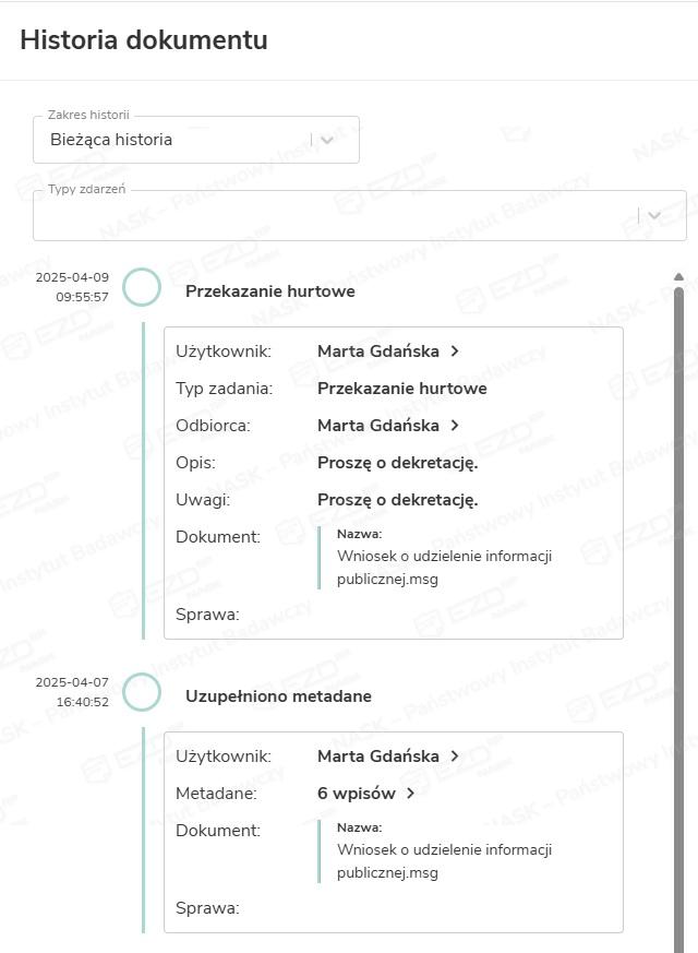 W EZD RP użytkownik ma możliwość zapoznania się z kompletną historią pisma lub historią jego dekretacji (w zależności od wersji systemu). Czynność ta jest możliwa do wykonania zarówno w odniesieniu do dokumentów znajdujących się w zadaniach czy w module Do obsłużenia, jak i w sprawach.
