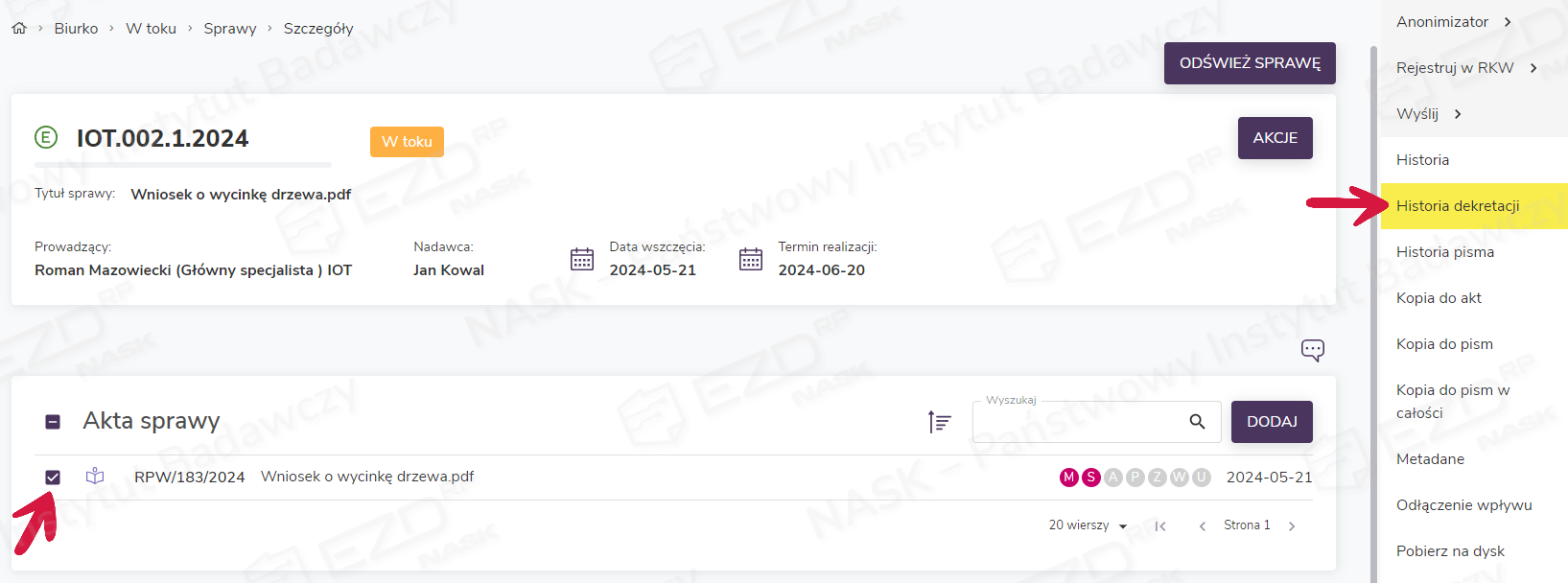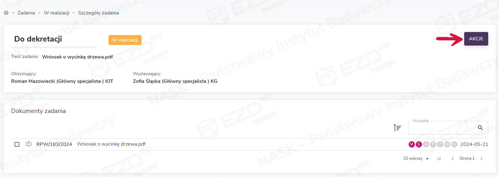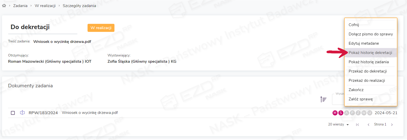 Użytkownik może również poznać historię dekretacji pisma, będąc w szczegółach zadania. Opcja Pokaż historię dekretacji dostępna jest pod przyciskiem Akcje znajdującym się po prawej stronie ekranu.