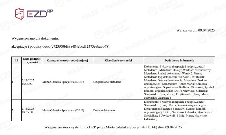 Informacje o historii dokumentu można przygotować do wydruku. Po kliknięciu przycisku Wydrukuj system wygeneruje plik w formacie PDF i wyświetli go na ekranie.