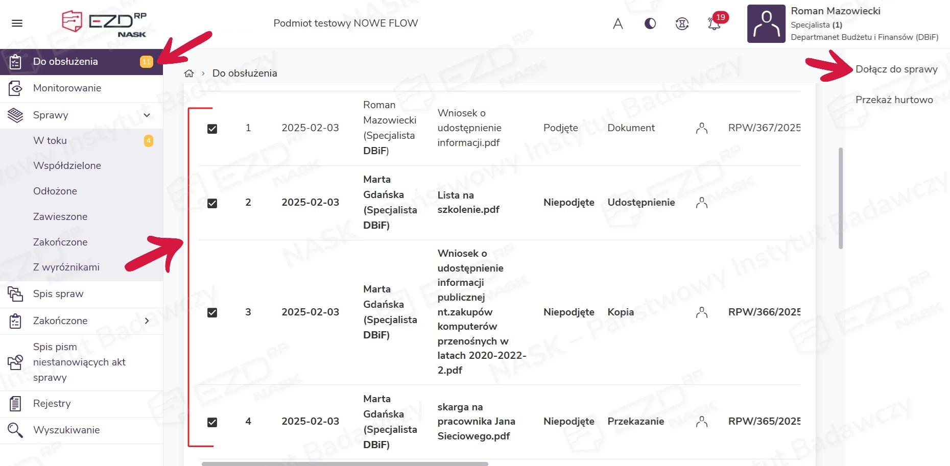 W systemie EZD RP możliwe jest dołączenie do sprawy wielu pism jednocześnie. Czynność tę można wykonać zarówno w odniesieniu do własnych spraw, jak i należących do innych osób – jeżeli użytkownikowi zostały do nich nadane uprawnienia lub dostęp w ramach współdzielenia sprawy. Korzystanie z tej funkcji zapewnia dużą wygodę oraz pozwala zaoszczędzić czas.