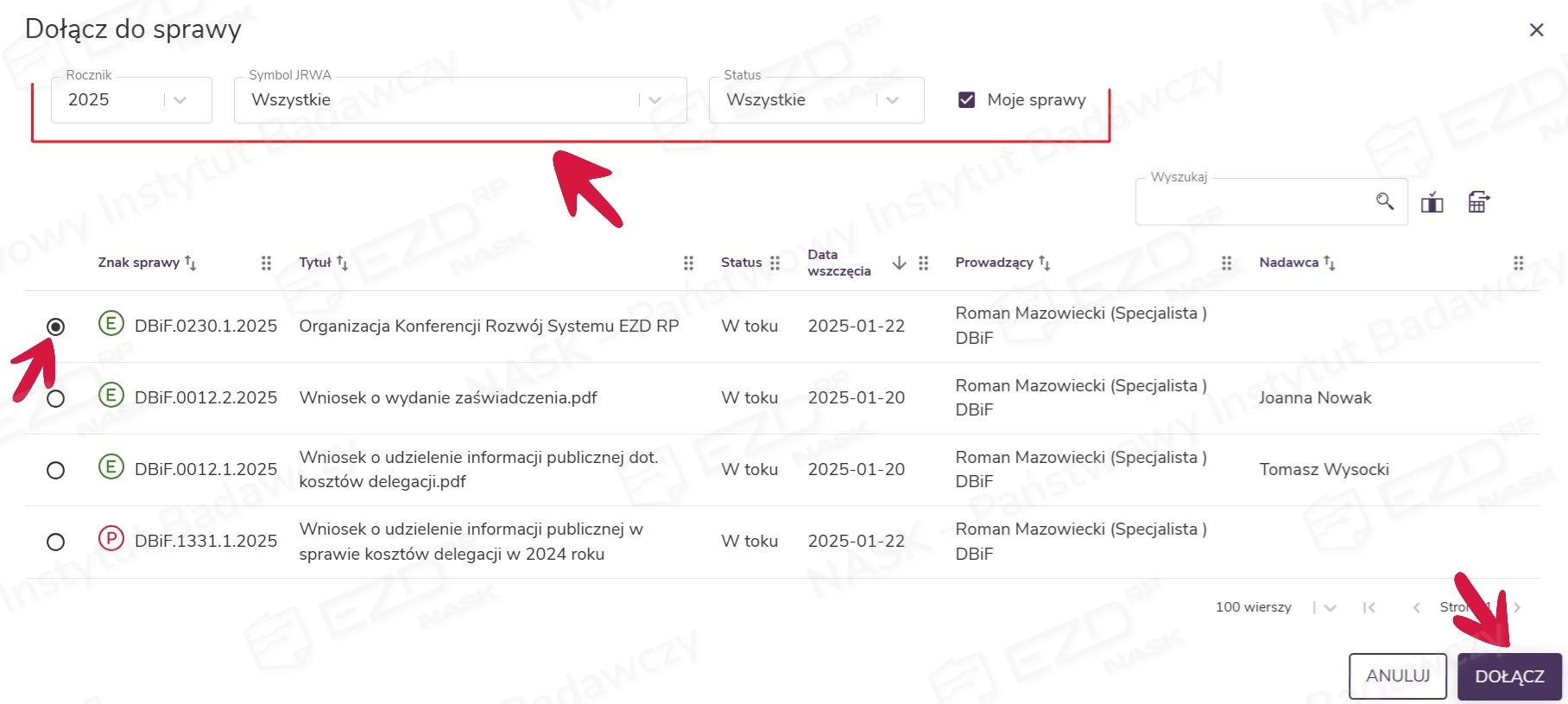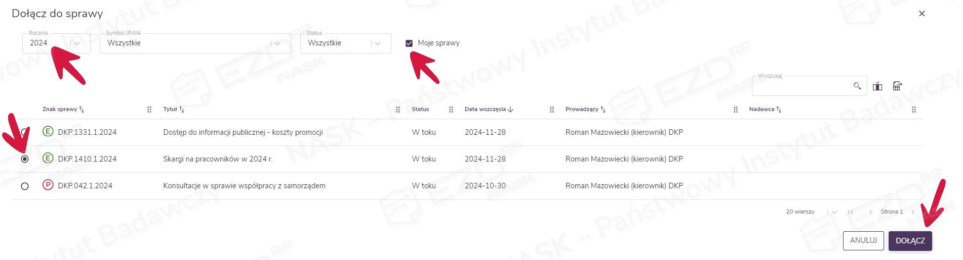 W kolejnym kroku trzeba wskazać sprawę, do której chcemy dołączyć wybrane pisma. Domyślnie system wyświetla w tym miejscu sprawy użytkownika założone w bieżącym roku – filtr umieszczony na górze strony pozwala jednak wskazać inny. Opcjonalnie można również przefiltrować dane przy pomocy symbolu JRWA i statusu. Odznaczenie pola wyboru przy opcji Moje sprawy spowoduje wyświetlenie spraw innych pracowników, do których użytkownik ma nadane uprawnienia lub dostęp w ramach współdzielenia sprawy.