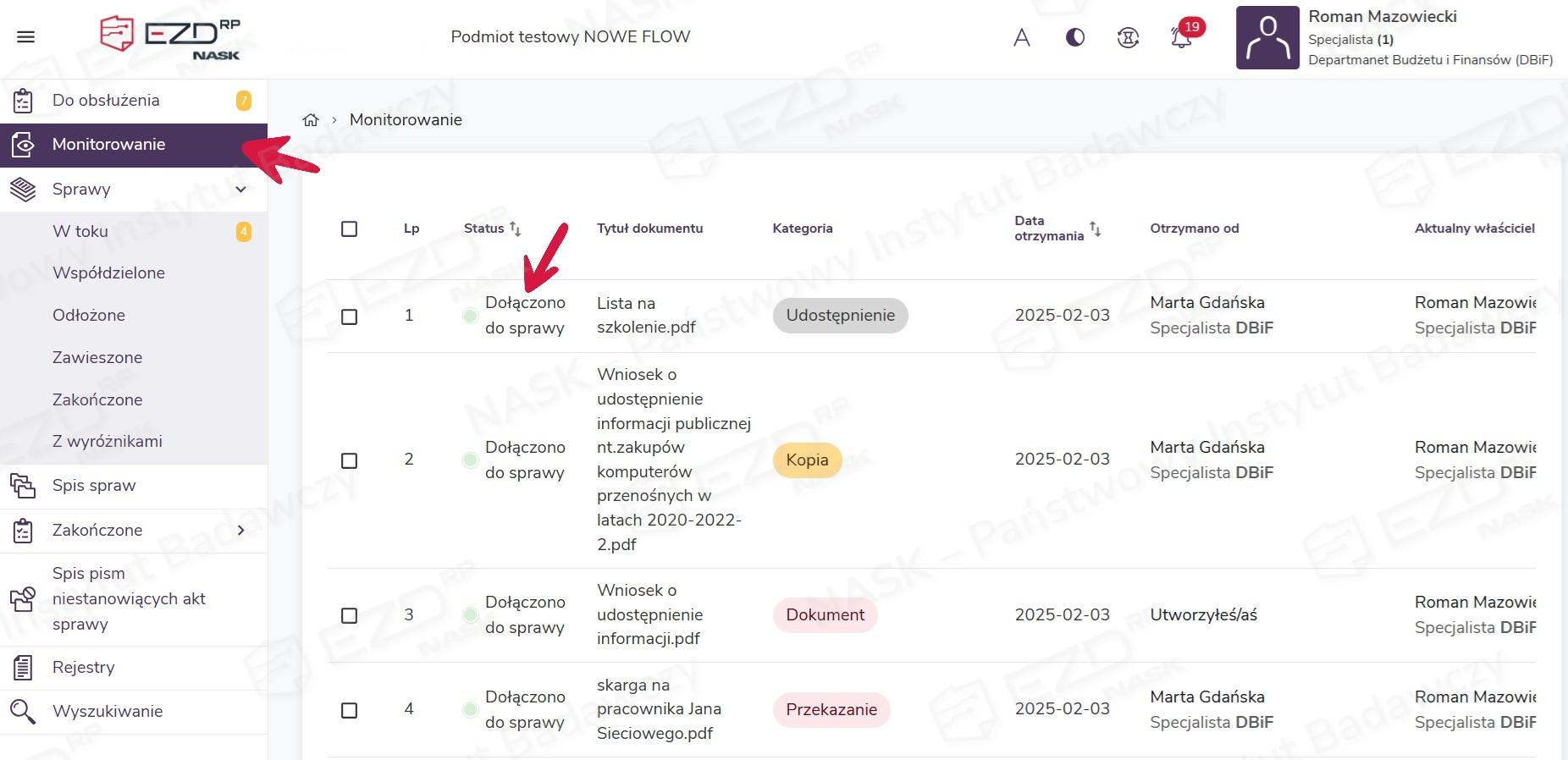 Jednocześnie w module Monitorowanie status pozycji, dla których wykonano opisywaną czynność, zaktualizuje się na Dołączono do sprawy.