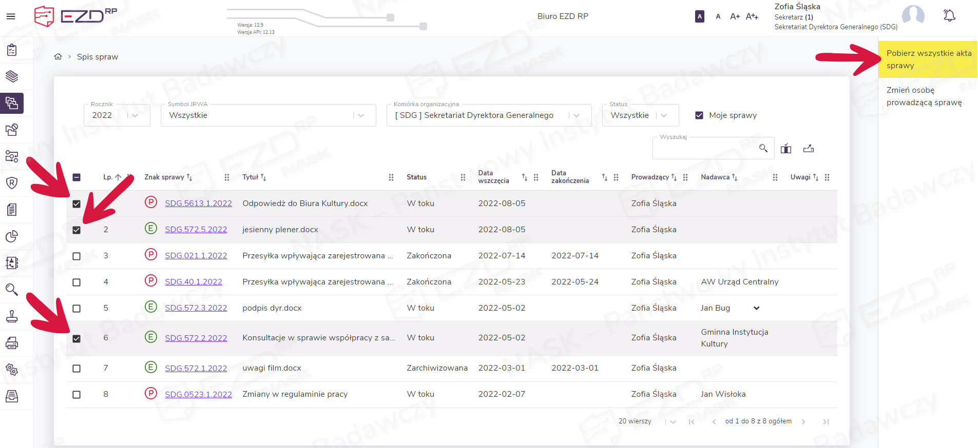 Użytkownik systemu EZD RP ma możliwość hurtowego pobrania wszystkich dokumentów znajdujących się we wskazanych sprawach. Funkcja, która pozwala wykonać taką czynność, została udostępniona w menu głównym w module Spis spraw.