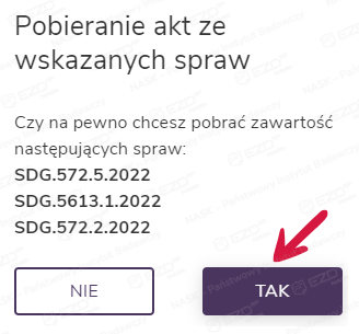 Następnie potwierdzamy czynność pobierania akt ze wskazanych spraw, klikając przycisk Tak.
