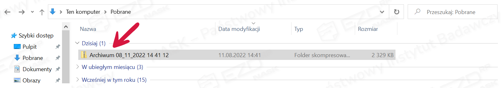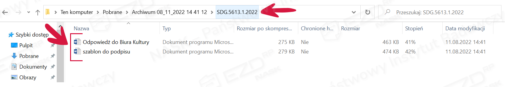 Pobrane dokumenty zostają zapisane na dysku w formacie ZIP w pliku o nazwie Archiwum, z dołączoną informacją o dacie i godzinie pobrania. Skompresowany plik zawiera hurtowo pobrane przez nas dokumenty pogrupowane według znaku sprawy.