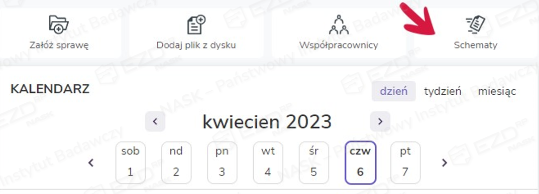 W celu zaimportowania kontaktów, należy kliknąć na stronie głównej systemu kafelek Schematy.