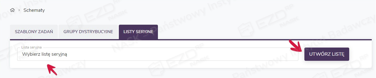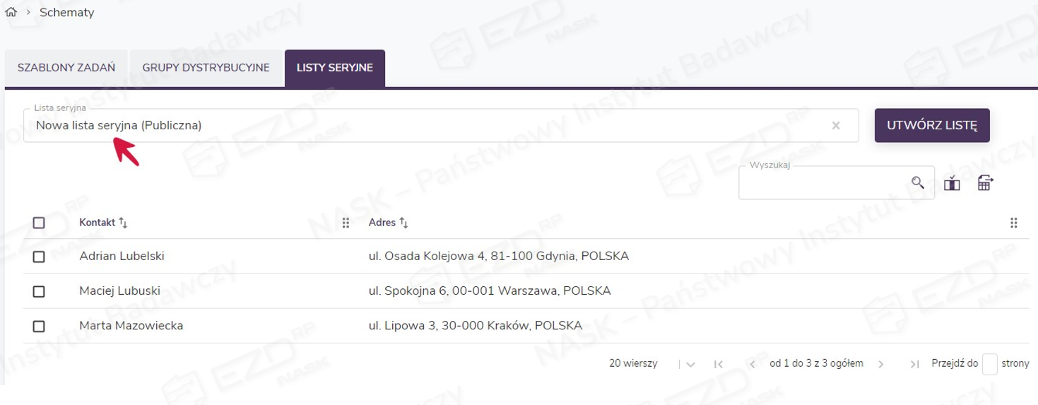Następnie w nowym widoku należy przejść do zakładki Listy seryjne. Kliknięcie pola o nazwie Wybierz listę seryjną spowoduje wyświetlenie dotychczas utworzonych list. Aby przyspieszyć wyszukiwanie lub sprawdzić, czy dana lista została już stworzona, można w tym polu wpisać nazwę listy.