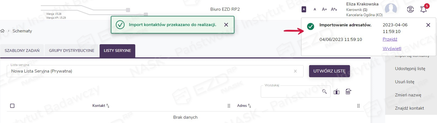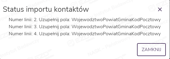 W przypadku gdy dane w bazie adresowej będą takie same jak na liście importowanych kontaktów, zdublowany kontakt nie zostanie ponownie dodany do bazy systemu, zostanie natomiast dopisany do listy seryjnej z istniejącej bazy kontaktów. W przypadku znalezienia różnicy w walidowanych polach (patrz ramka wyżej), kontakt będzie dodany do bazy jako odrębny wpis i w takiej postaci będzie dostępny na tworzonej liście seryjnej. Zaimportowane kontakty zostaną wyświetlone w postaci listy.